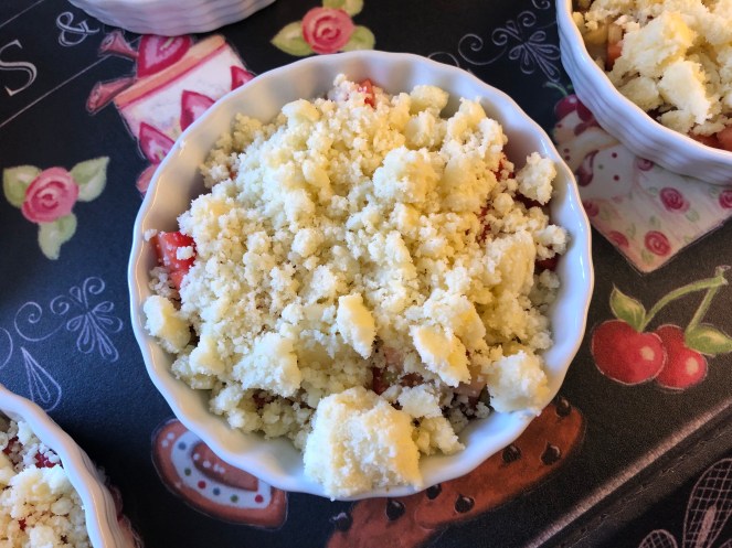 Dir musst d’Äerdbier an de Rubbarb kleng schneiden a mat 2-3 Iessläffelen Zocker séissen (muss net onbedéngt sinn, wann der et léiwer bësse méi sauer hutt). Da verdeelt der d’Uebst an eng gliese Schossel (dir musst d’Schossel net afetten).