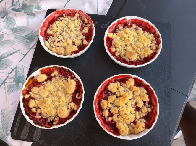 D’Rezept ass fir 4 Persoune geduecht. Mee dat geet bei mir ëmmer bëssen op Ongeféier. Et kann ee roueg méi Äerdbier, Rubbarb oder Crumble huelen. Fäert do net fir ze experimentéieren. Sidd verréckt, toobt iech aus…traut iech:-)