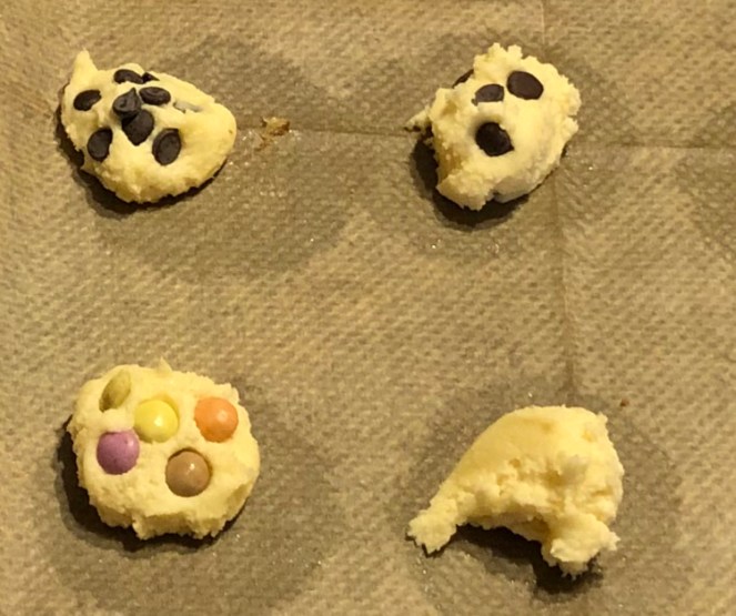 Hei ee Rezept wat sech perfekt ubitt fir zesumme mat Kanner ze „baken“. Dat heescht et leeft folgendermoossen of: ech maachen den Deeg, preparéiere kleng Kéipercher op engem Bakblech an DUERNO duerfen d’Kanner Smarties, Schockelasstécker, Mini-Marshmallows, Korinten, Nëss asw drop verdeelen.